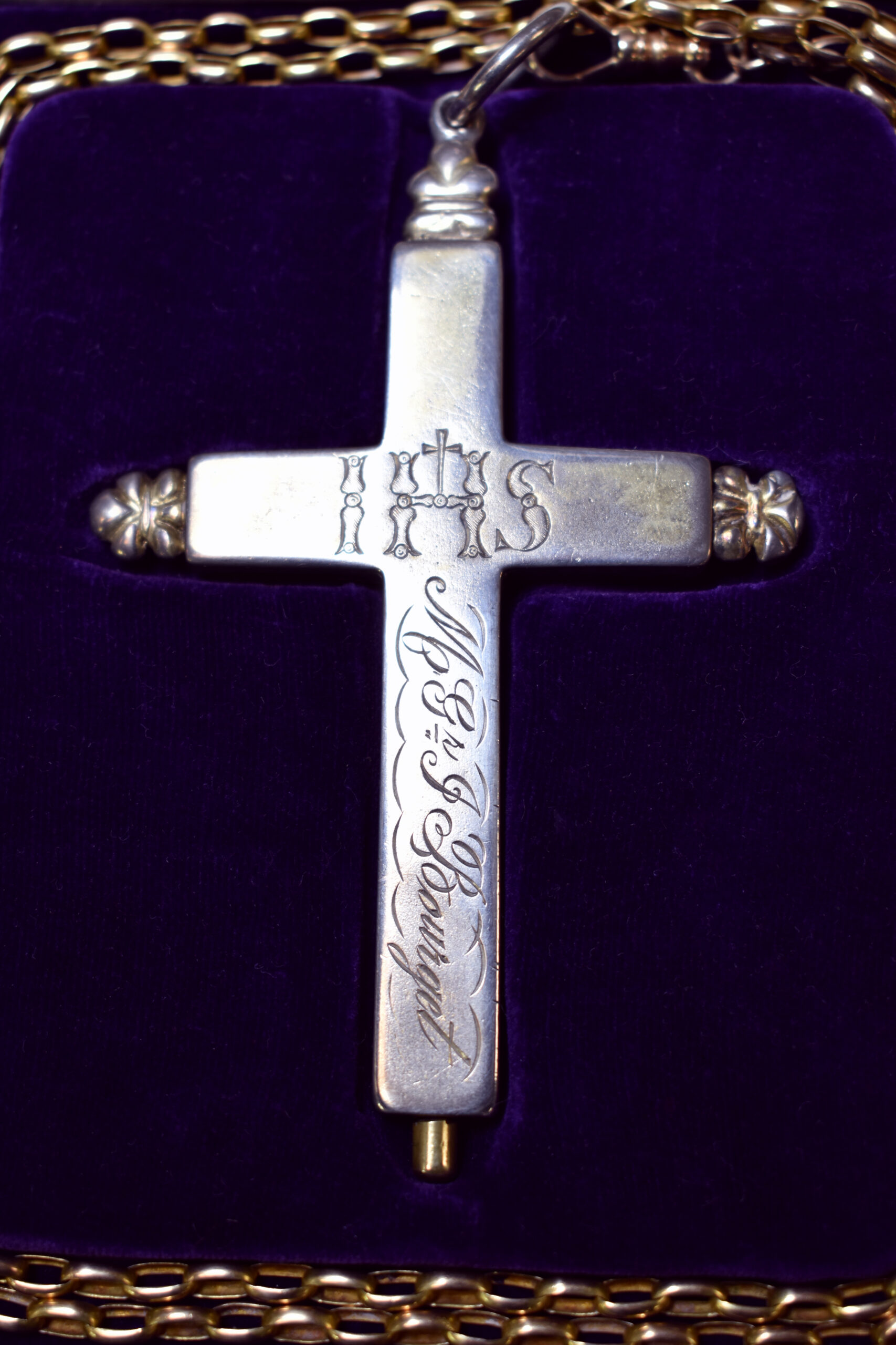 Dans une récente publication, nous avons présenté un portrait photographique de Mgr Ignace Bourget en habit d’apparat. Sur cette photo du studio montréalais L. E. Desmarais datée de 1881, le prélat arbore une croix pectorale qui lui aurait été léguée par son prédécesseur le sulpicien Mgr Lartigue, a découvert l’historien d’art Robert Derome. Dans un fascinant article paru dernièrement en ligne (https://rd.uqam.ca/Lartigue/index.html#Leggo), M. Derome retrace la provenance de cet ornement désormais conservé par les Religieuses Hospitalières de Saint-Joseph de Montréal. Il y révèle également un secret jusque-là bien gardé : la croix renferme des reliques et une image du Christ.